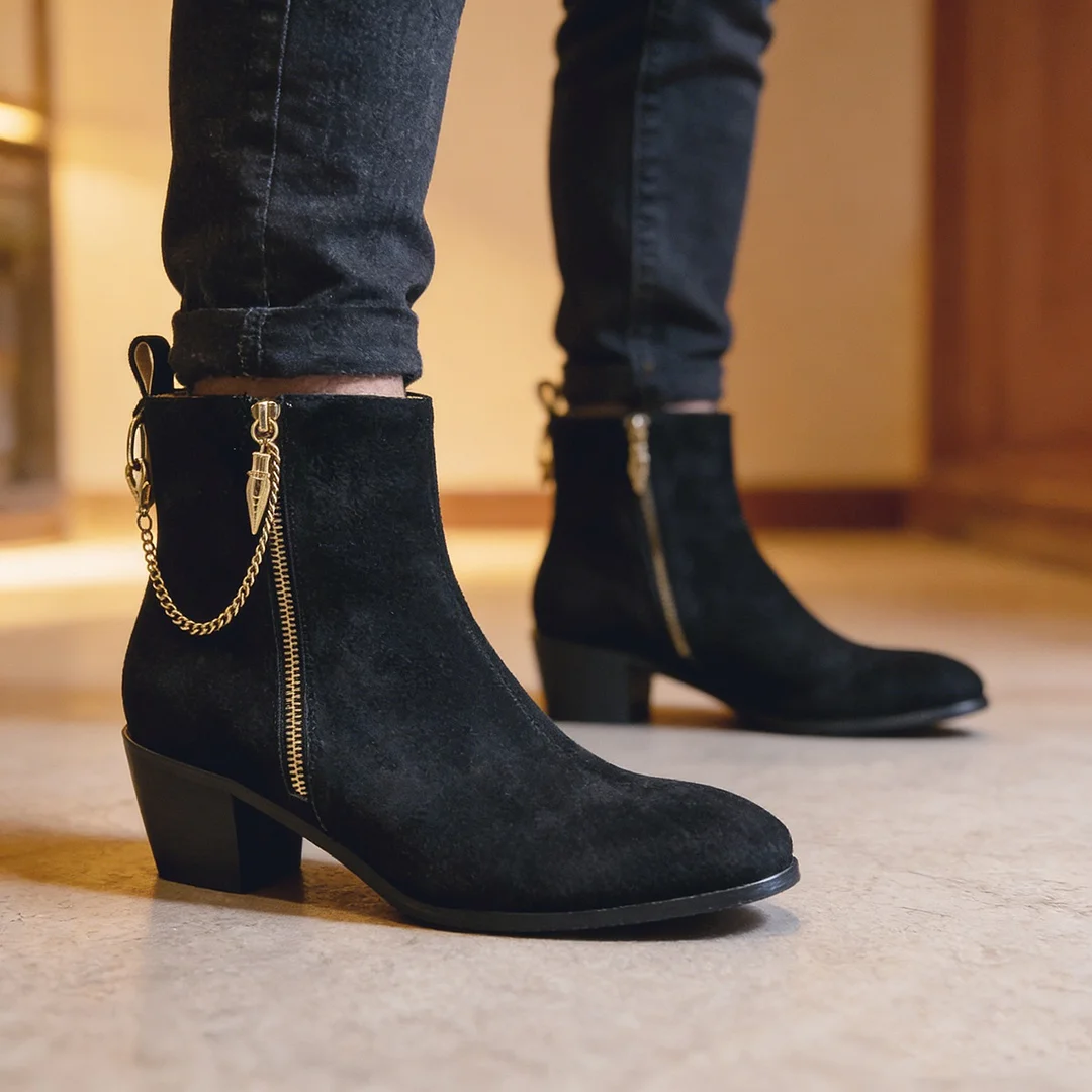 Gentleman's Block Heel Chelsea Black Suede Round Toe Boot Red Bottom Boots VOCOSI VOCOSI